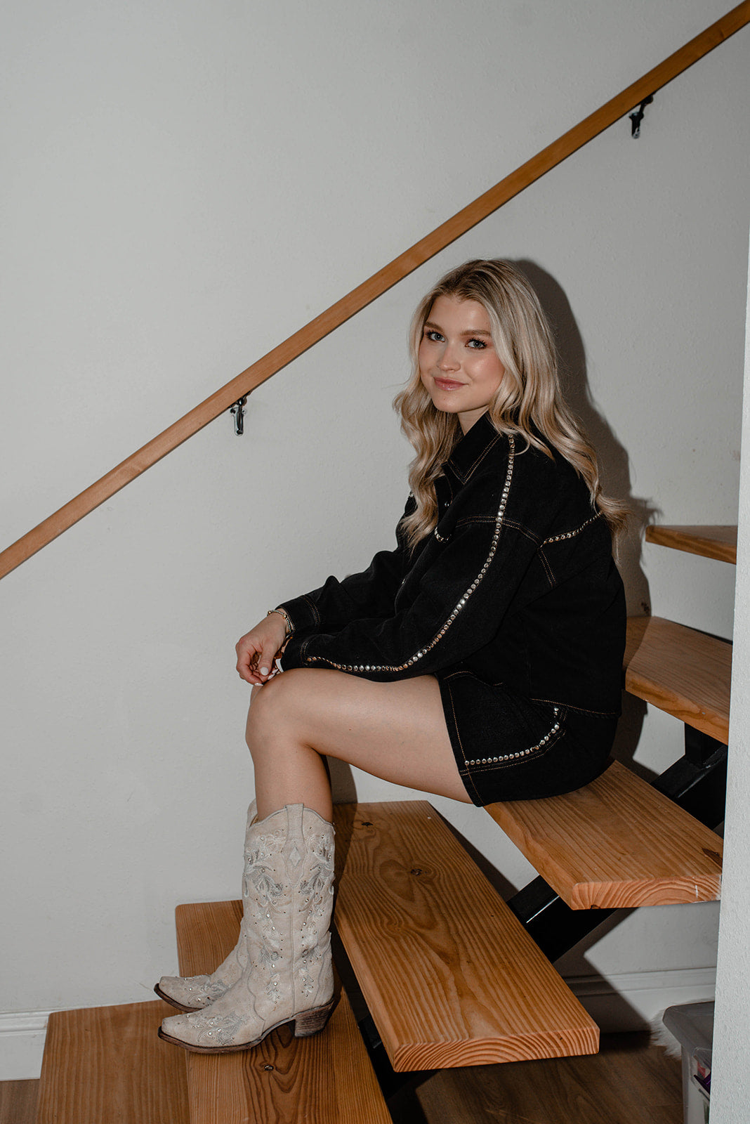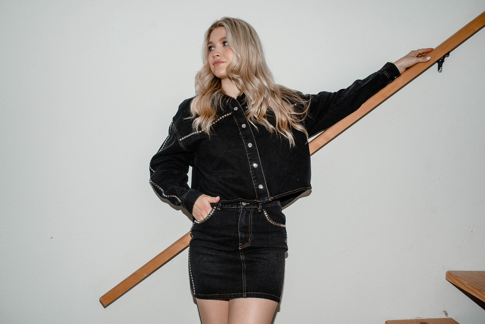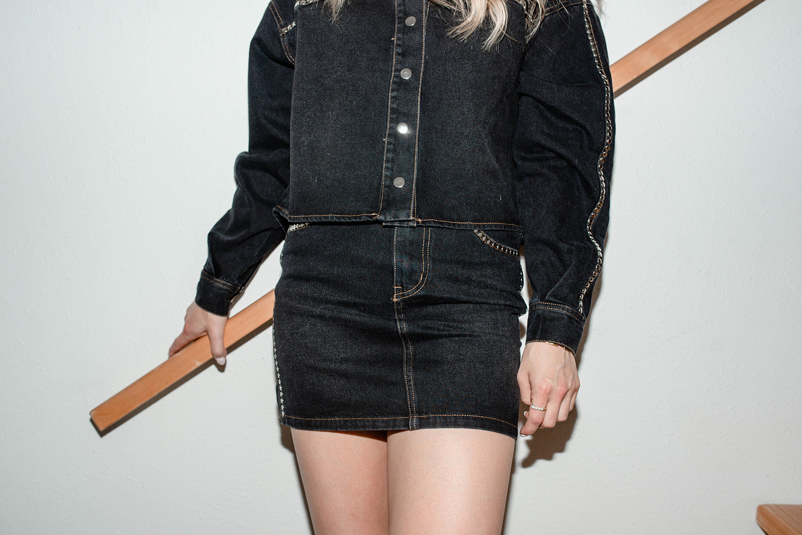 Your most versatile wardrobe piece. Wear it with the set, wear it separately, the outfit options with a classic black denim skirt are endless.